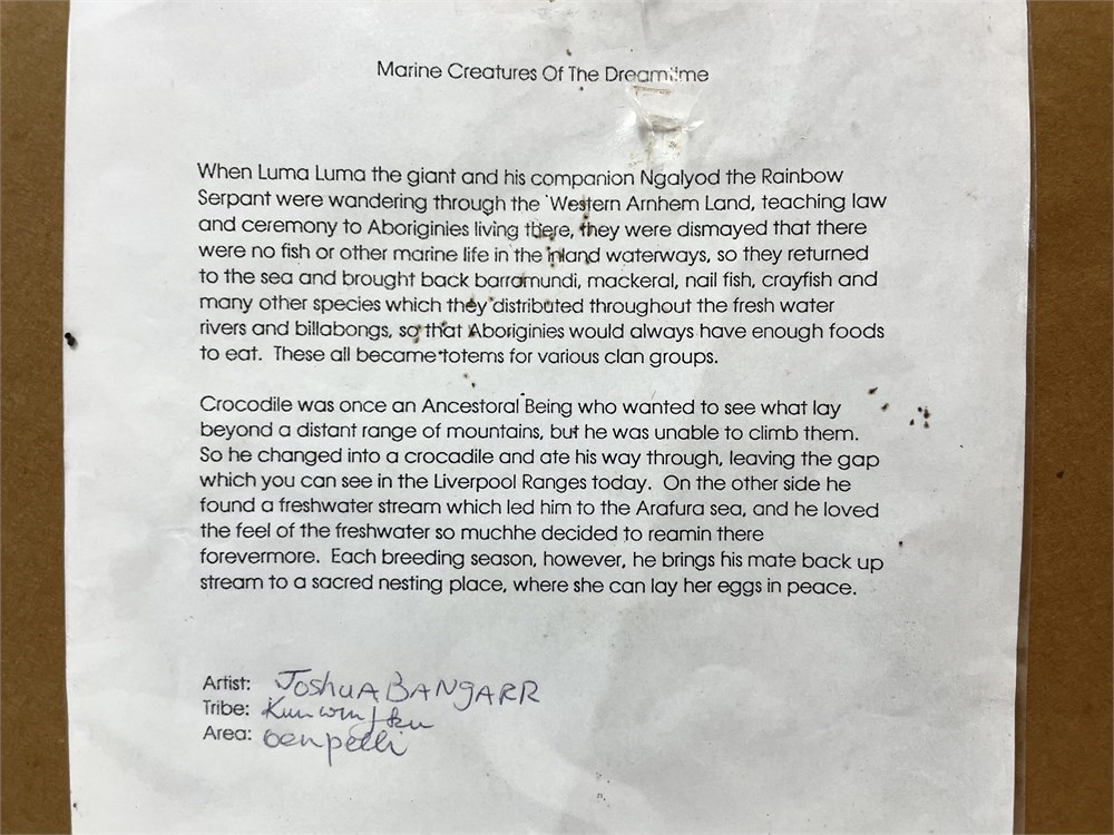 20th century Aboriginal artist Joshua Bangarr, Kunwinjku tribe, Oenpelli area.  An original painting titled "Marine Creatures of the Dreamtime."  On the back is a story of the creatures being depicted.  This work is on paper and framed under glass.