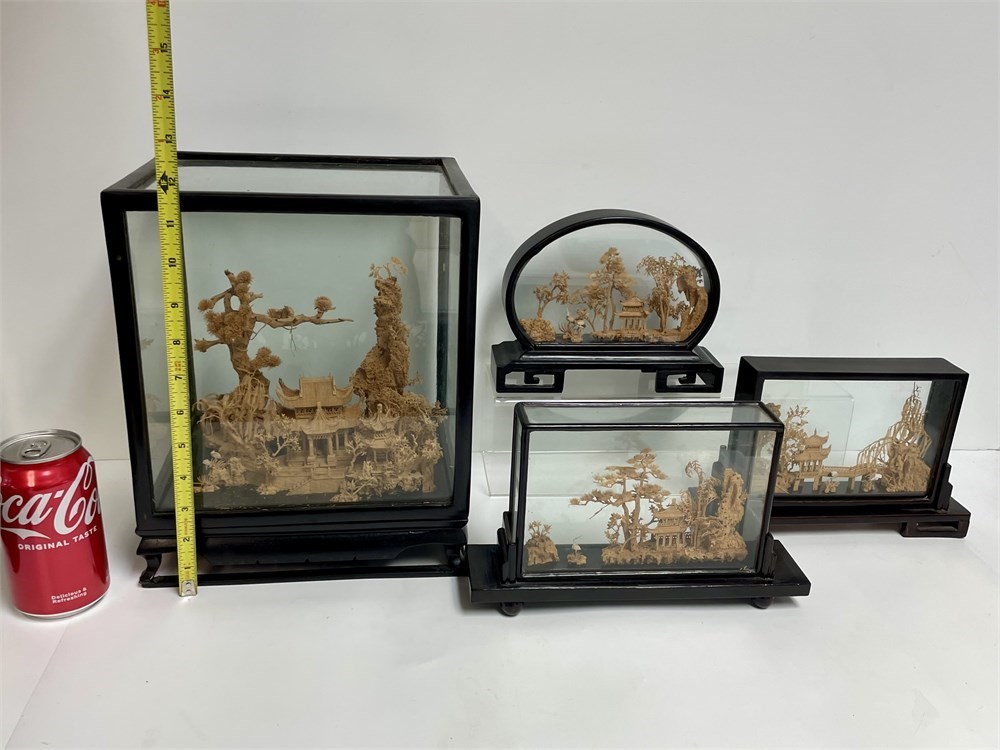 Detailed scenic cork sculptures.  3 are enclosed in glass; and the largest one has a lift-off glass display box.  Condition of the largest one is not good, the cork is disintegrating unfortunately.  The glass enclosure is still useful though.  The other 3 are better but not perfect.