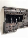 A handsome desk organizer or notary station that is packed with small drawers, hidden drawers, a door compartment, and cubbies.  Details include columns (which are also containers), brass knobs, and carved accents.  Good condition, it looks really nice, and the back side is finished too.