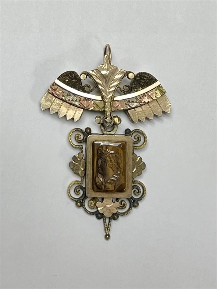 A wonderful antique pendant full of details.  It is unmarked but apparently gold-filled.  The front features tri-color design, scrolls, engraving, and a tiger eye carved cameo.  The back has an empty window that could hold hair.
