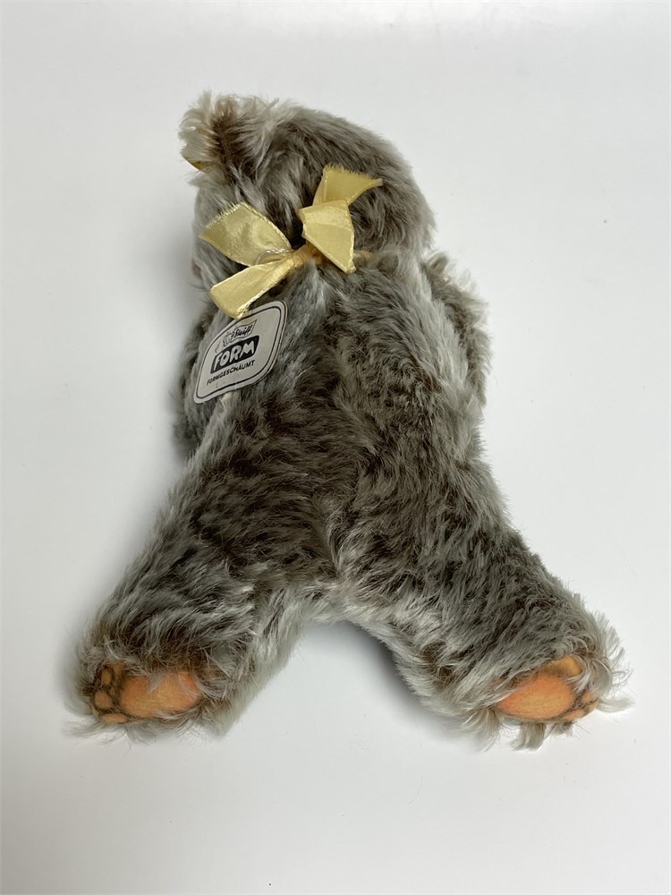 Steiff Floppy Zotty lying down teddy bear, with bow collar, tag and button in ear, and Steiff Form hang tag.  About 7" long, good condition.