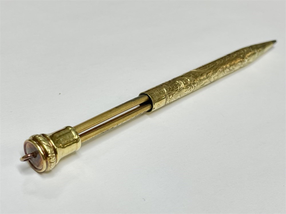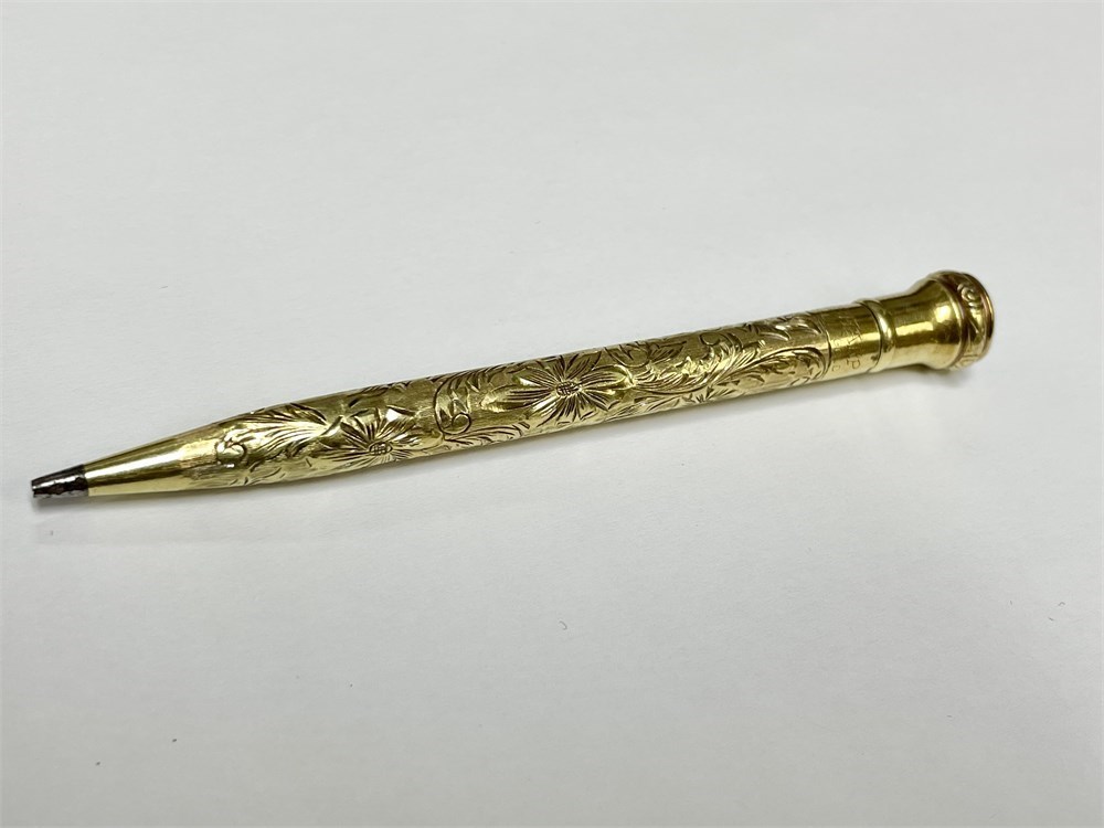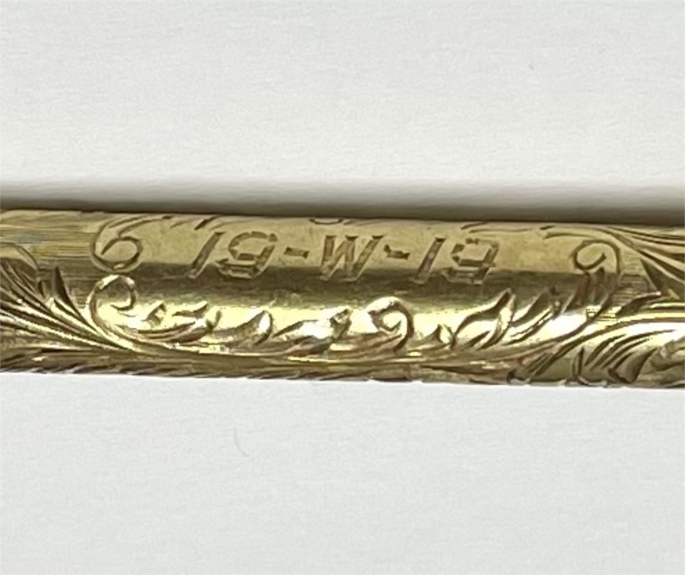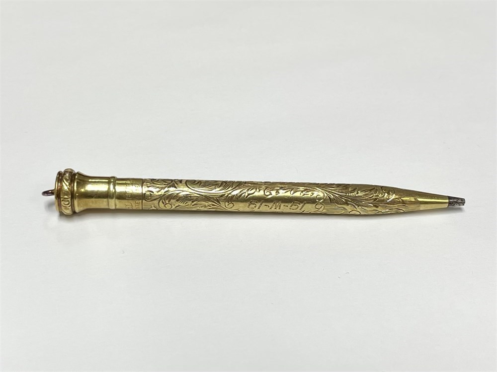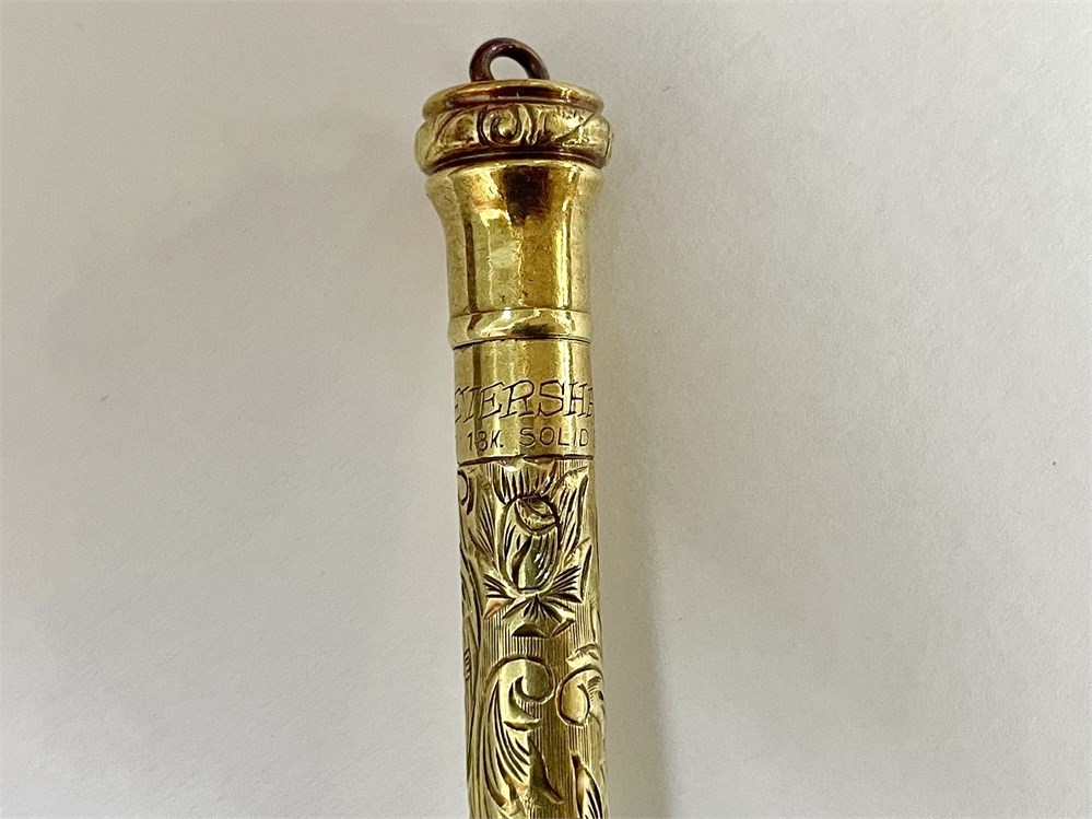A nicely engraved antique pencil, marked: "Wahl Eversharp, Patented, 18K Solid Gold".  It is personalized "19-W-19".  It's 4" long, plus a small bail at the top.  The internal parts appear to be brass(?), and marked: "12 Leads 25c The Wahl Co. Chicago."  Although the exterior is 18K gold, the actual amount of gold in the entire pencil is unknown, so bid your opinion.