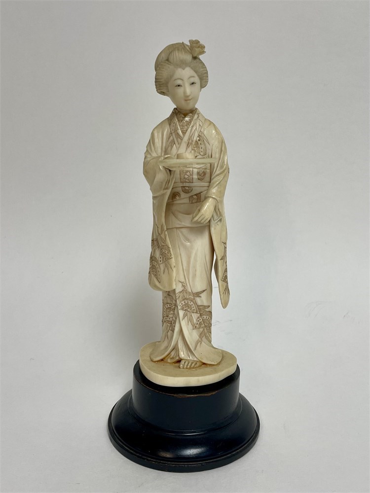 She's absolutely beautiful!  A Japanese ivory okimono of a geisha carrying a plate, delicately carved, fine features, detailed clothing.  Condition:  Head and right hand detach.  The right sleeve has a chip.  The flower in her hair is chipped and reattached.  Please see the pictures or come to preview for details.  Despite the flaws, we think you will still love this piece.  Signed on the bottom.  Found with a stand, which is included.