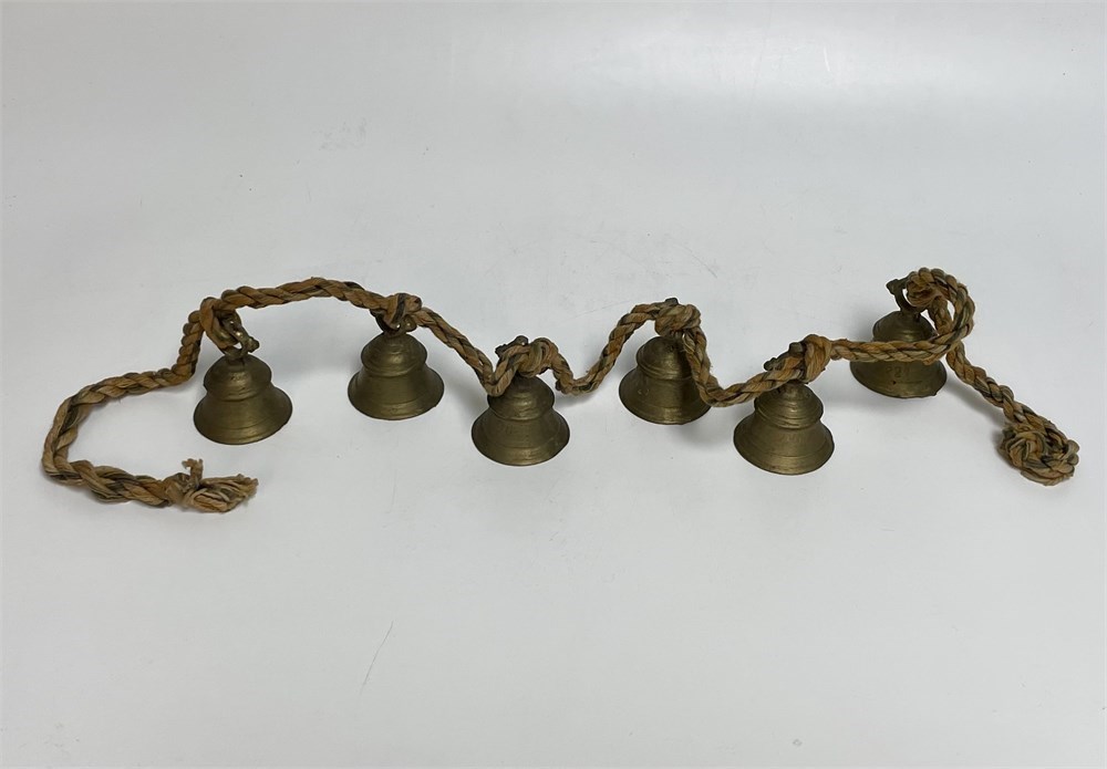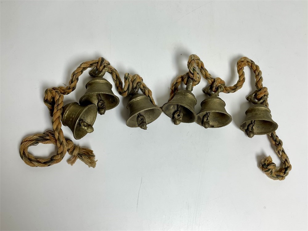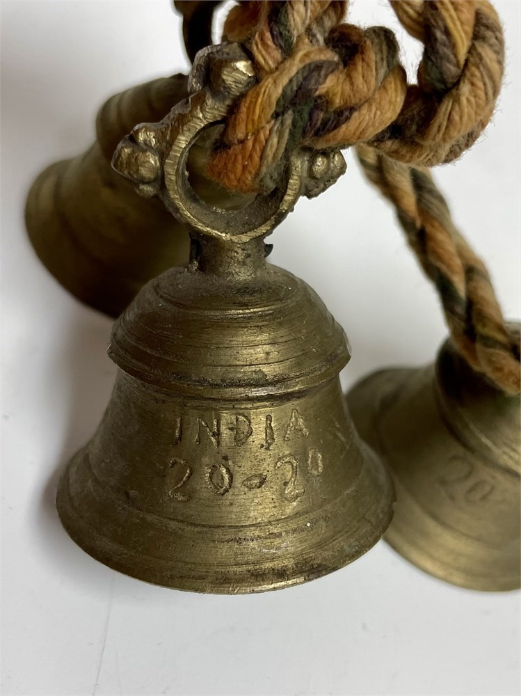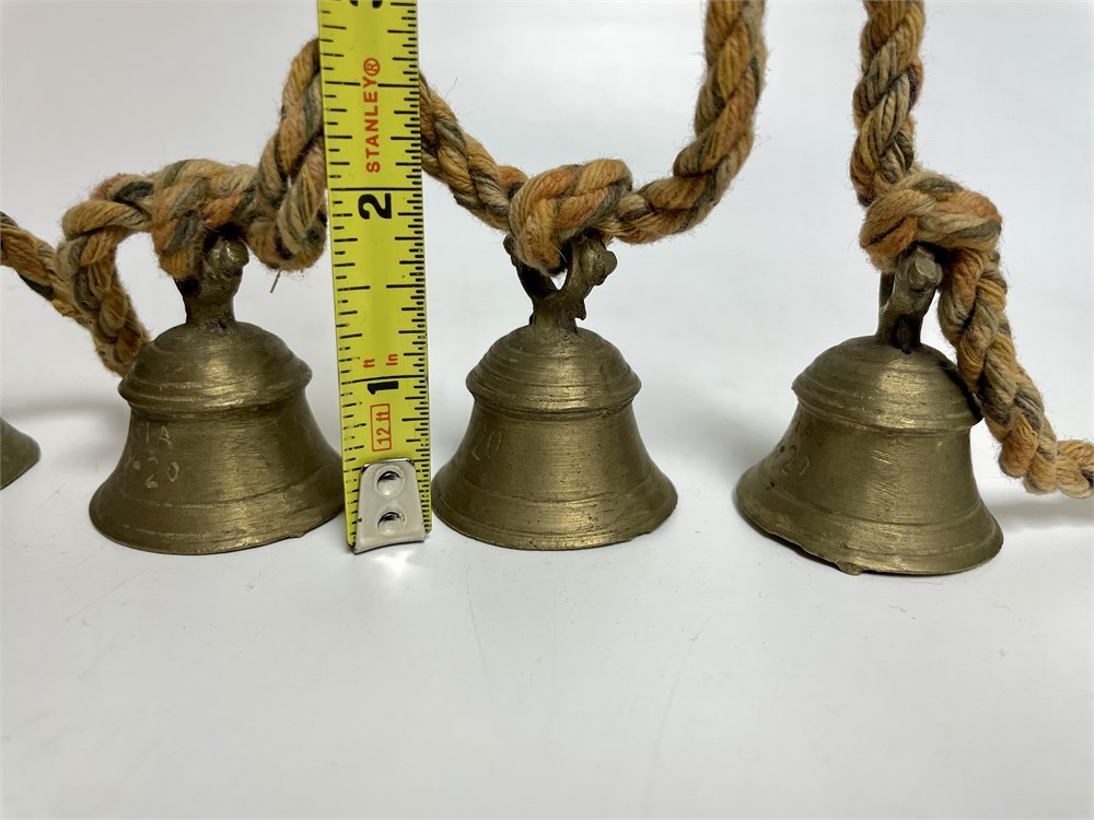 Vintage set of 6 bells on rope, each about 2" tall, all with clappers, marked India as pictured.