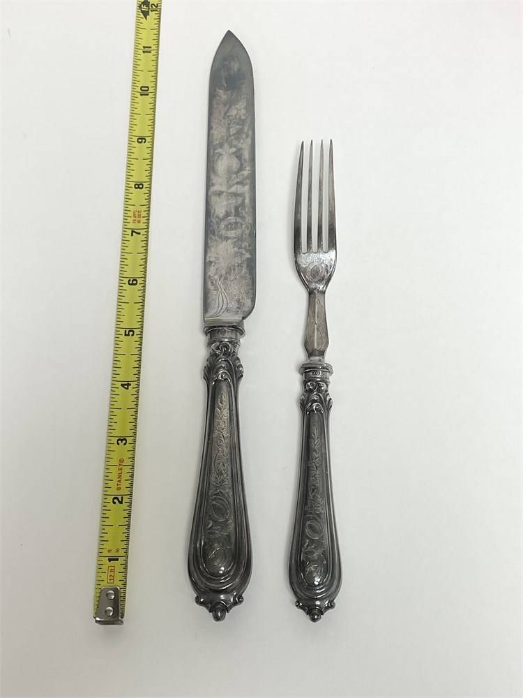 A 19th century English serving fork and knife, fully engraved but not monogrammed, with sterling silver handles.  Several British hallmarks including the Birmingham maker, John Gilbert.