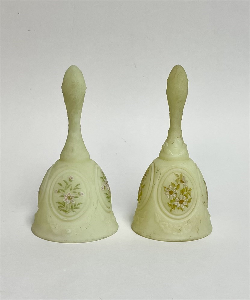 2 uranium glass bells, decorated with hand painted flowers and coralene-style glittery accents on them.  Signed GE Schlicher and Lisa Westbrook.  No damage other than some stray marks which should clean.  They both glow under blacklight.