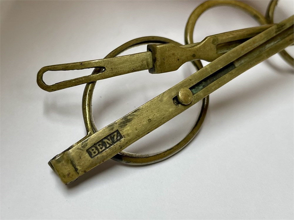 Shuron gold-filled glasses with octagonal engraved rims.  And unusual antique brass Benz glasses with sliding temple arms.