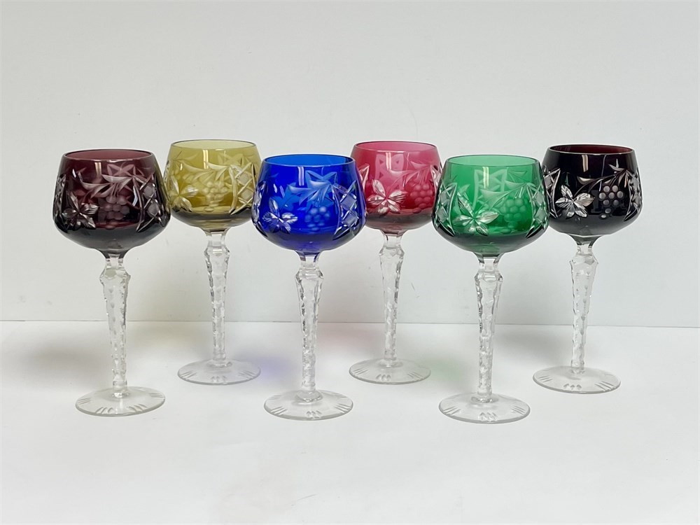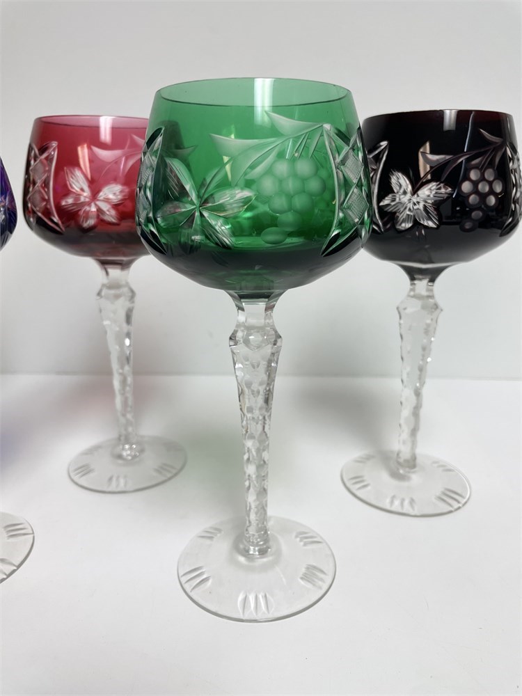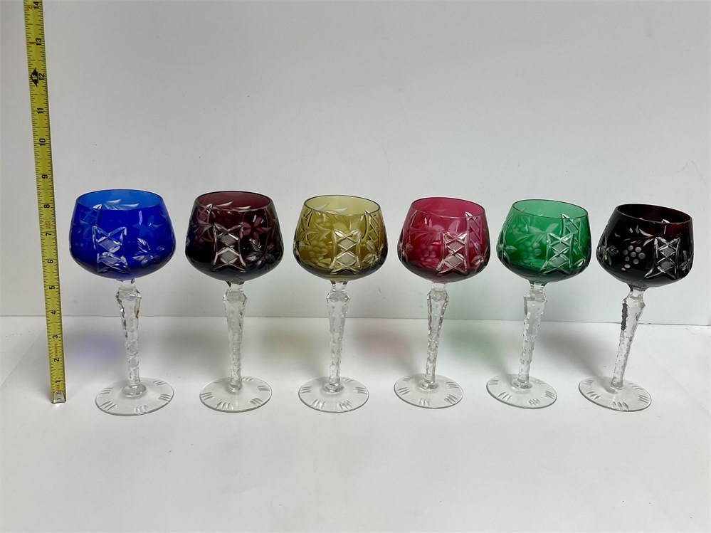 Cut to clear stemware in assorted colors.  All in good condition, no chips or cracks.  About 8" tall.  Probably German-made by Lausitzer.