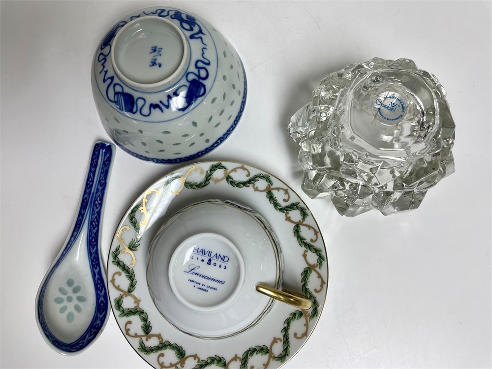 5 pieces in good condition, no chips or cracks.  The star of this lot is the very nice (rare) Haviland Limoges Louveciennes flat cup and saucer.  Other items include:  Antique porcelain hand painted apple cider pitcher, stamped Limoges.  4" crystal vase, probably Lenox.  Rice grain porcelain bowl with spoon.  Goebel crystal candleholder with tag on the bottom.  All for the bid!