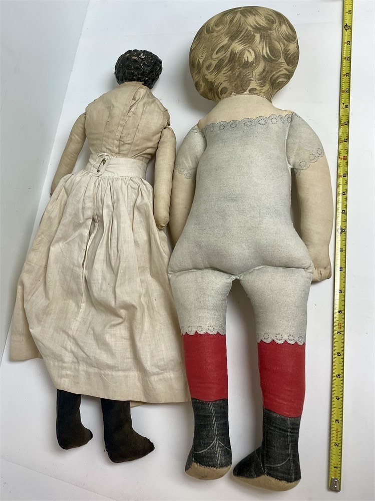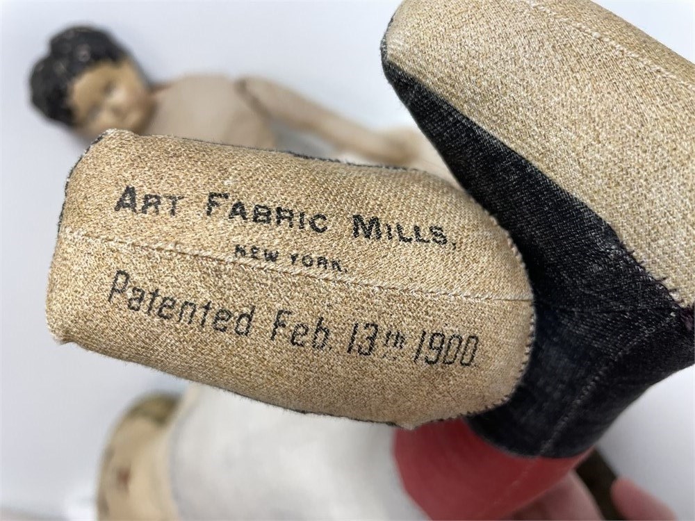 A 24" stuffed cloth girl doll with foot marked: Art Fabric Mills, New York, patented Feb. 13th, 1900.  And a 19th century cloth doll, dressed including pantaloons, with composition head.