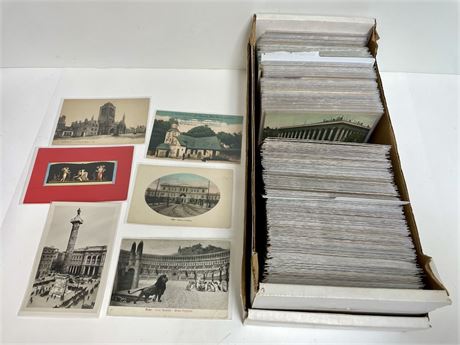 An organized box of sleeved cards.  Many/most are sepia or black and white.  Most seem to be European.