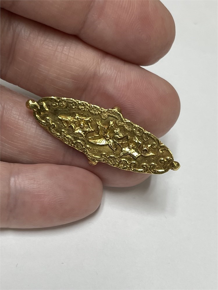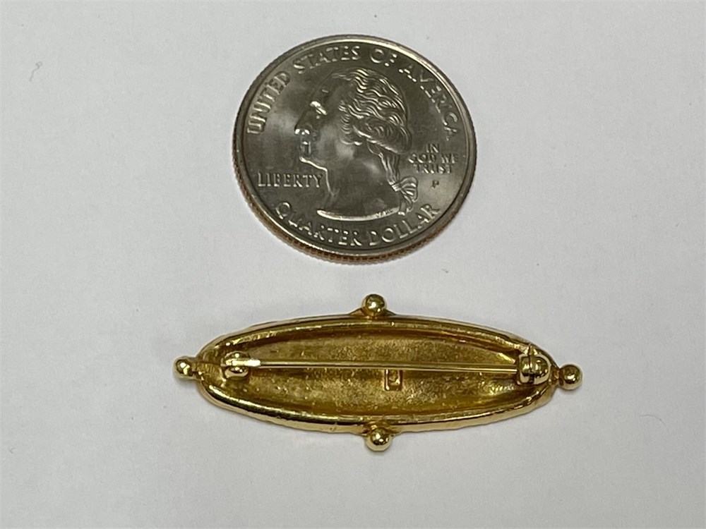 An oval bar pin with floral design and charming vintage style.  Marked 14K.