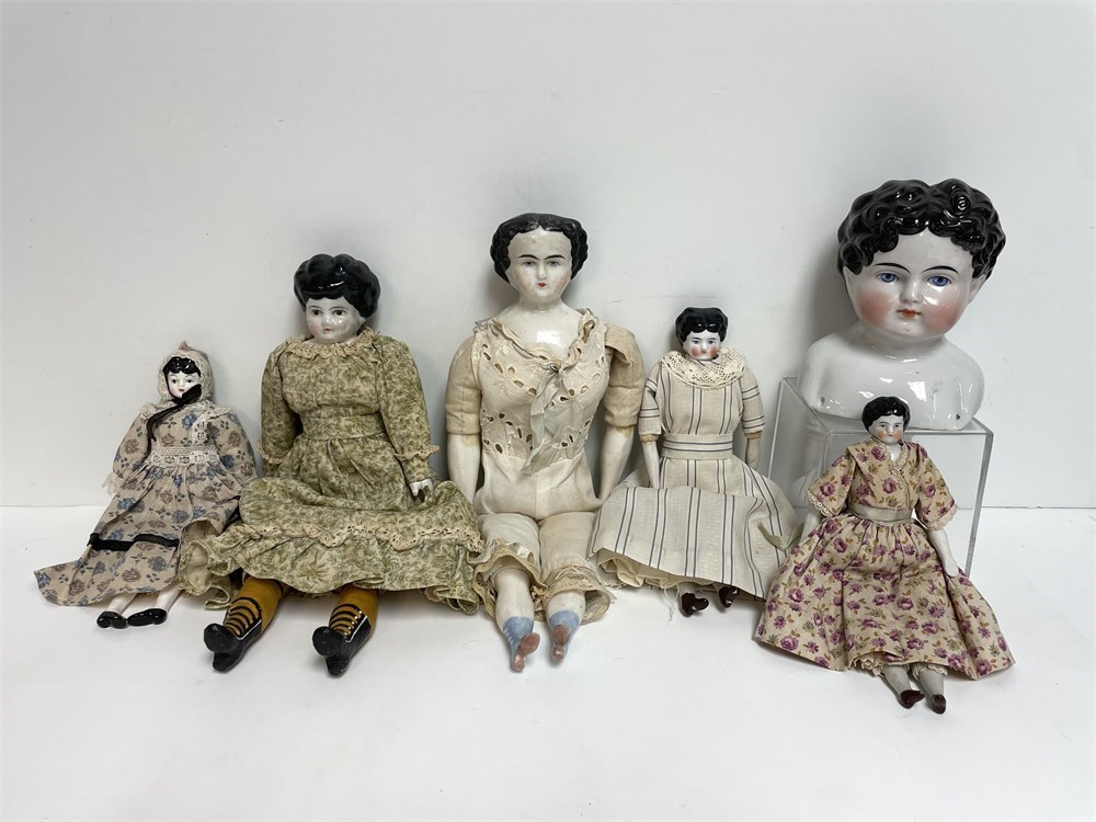 5 china head dolls with cloth bodies and china hands and feet.  Also a single china head for a doll.  A range of sizes and no apparent damage.