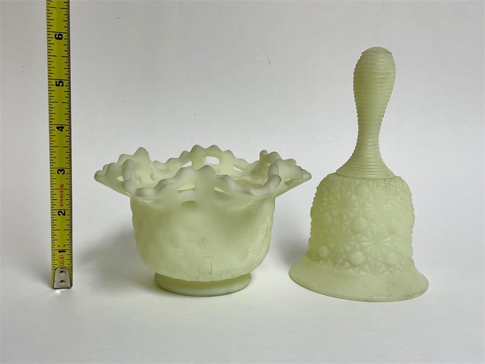 3 piece group.  Two are satin glass: a daisy-and-button bell, a basketweave design bowl.  The 3rd piece is a footed dish that appears to be missing a top.  No chips or cracks; they could use some touch-up cleaning.    They all glow under blacklight.