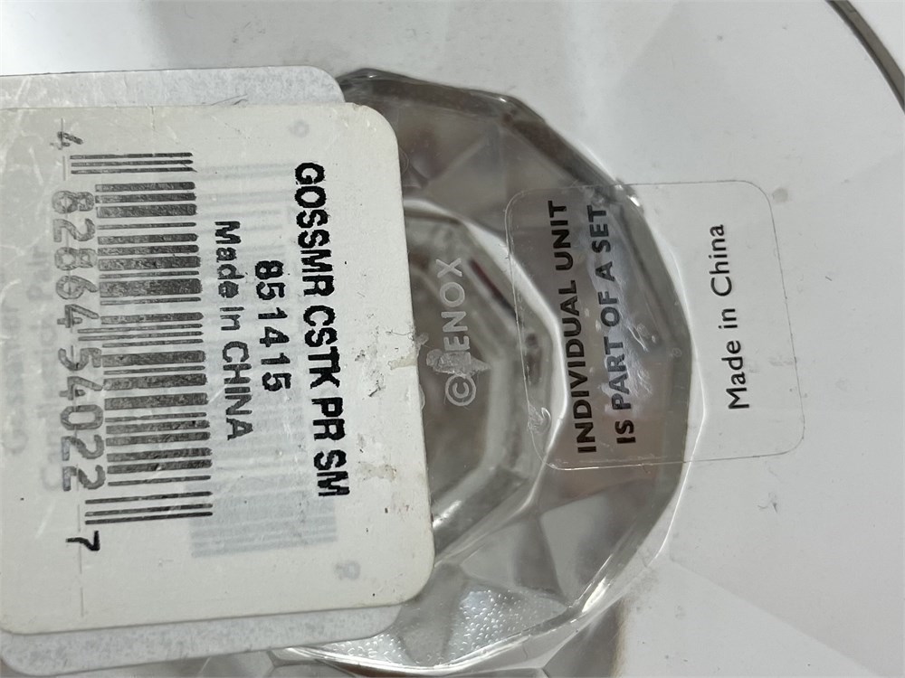6 unmarked clear stemware goblets; 2 nice stemmed glasses that are probably Cristal d'Arques; a pretty set of 6 royal blue cut-to-clear glasses; all are about 6" tall on average.   Also an 8" pair of Lenox crystal candlesticks.  All in good condition, no chips or cracks.