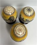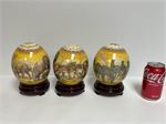 3 ostrich eggs with stands.  Each is covered (decoupaged?) with a ceramic-like finish featuring African wildlife: elephants, lions, zebras.  They are unmarked but almost certainly produced by Haus Design.
