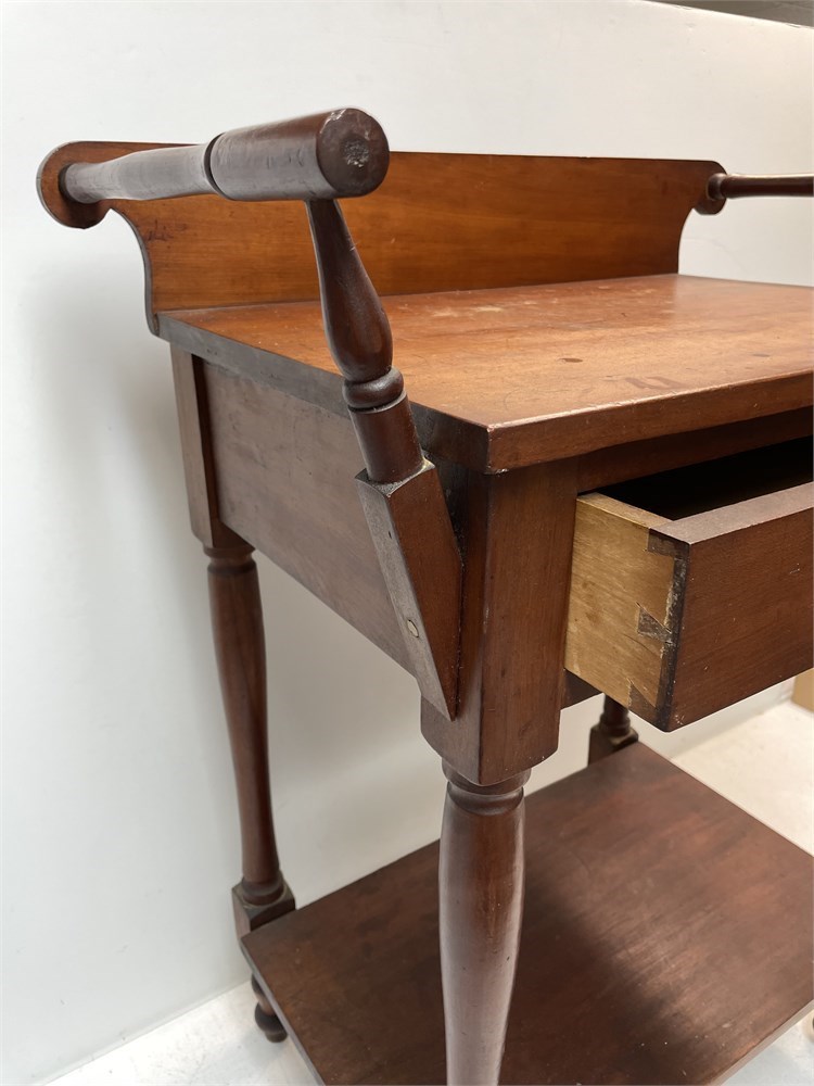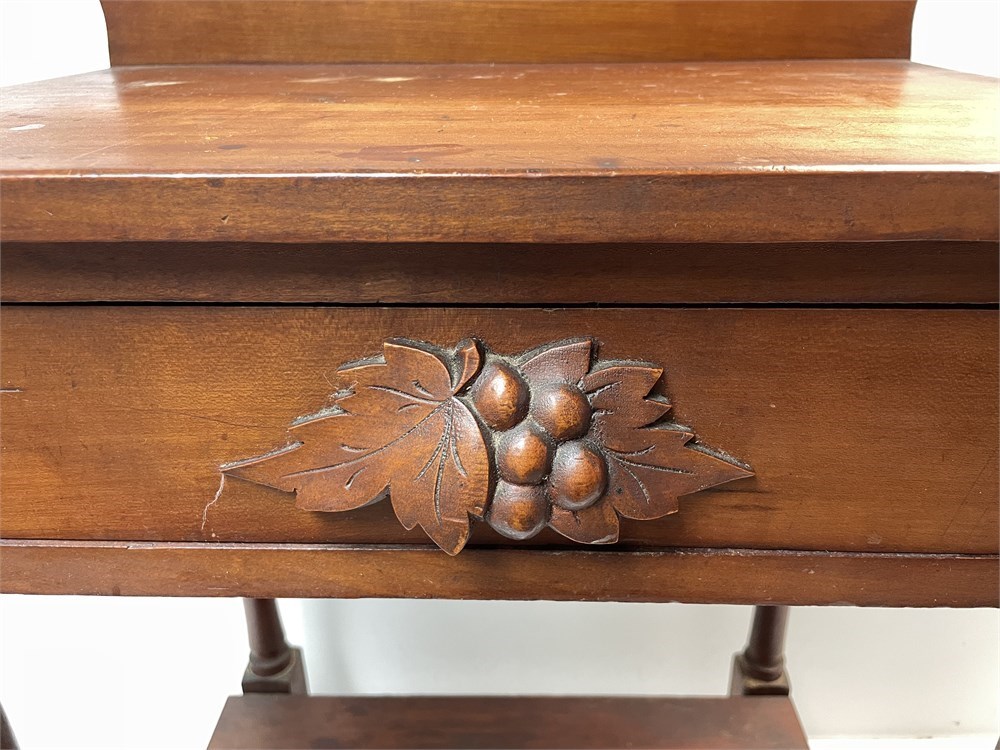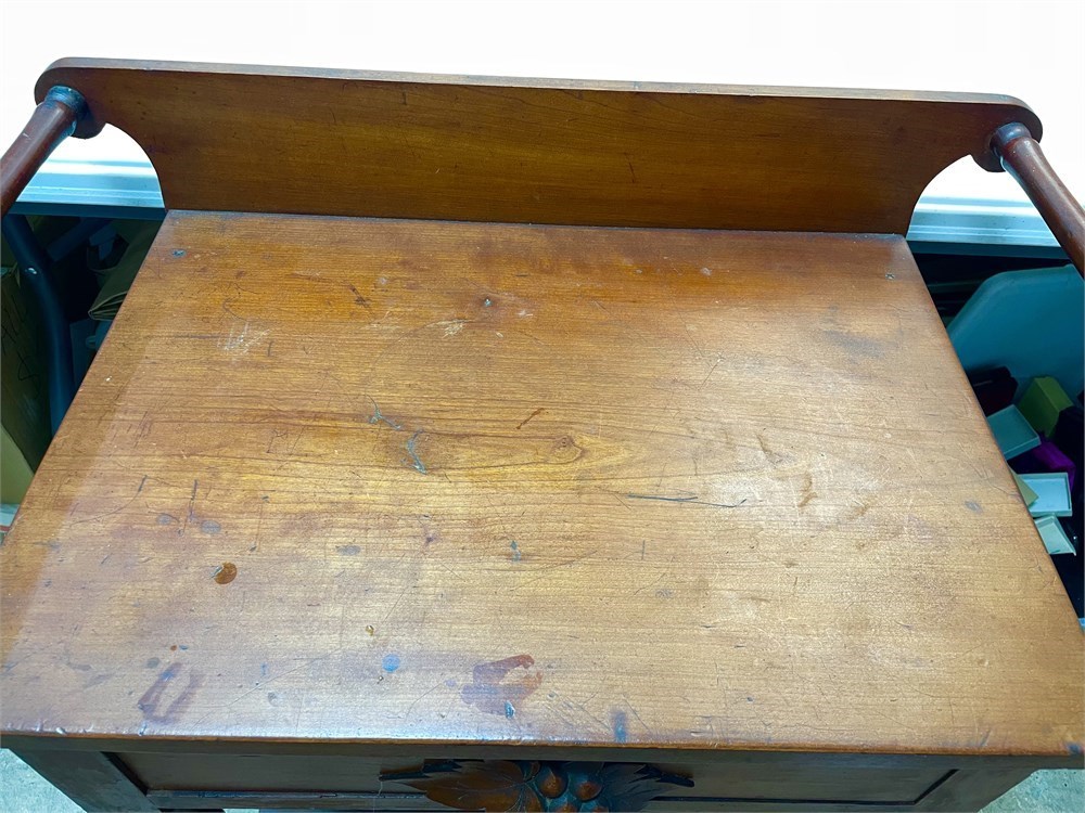 A cute wash stand that would work just about anywhere as a handy table.  It features a carved fruit drawer pull, and is in typical condition for its age, and sturdy.