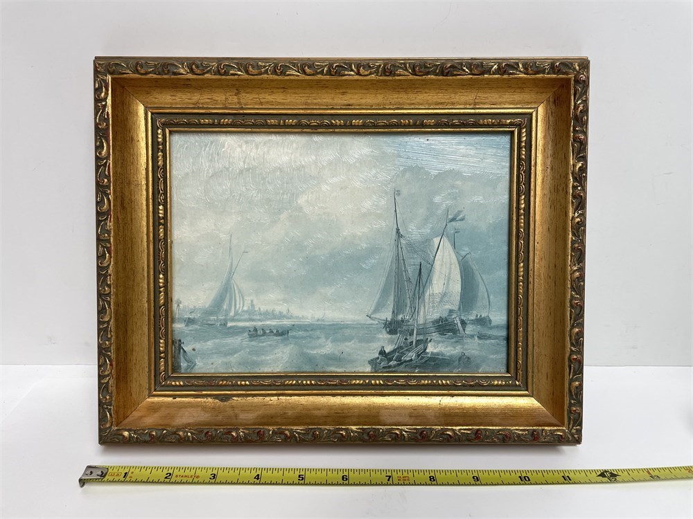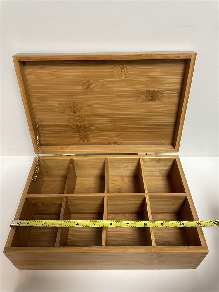 Good condition group of eclectic items.  A nice wood storage box with divided interior.  A vintage carved wood wall shelf with match holder flowers.  A vintage picture in cute frame.  A tea set with hat-box style storage from the Victorian & Albert Museum, London.  2 vintage needlework pieces, rolled up.