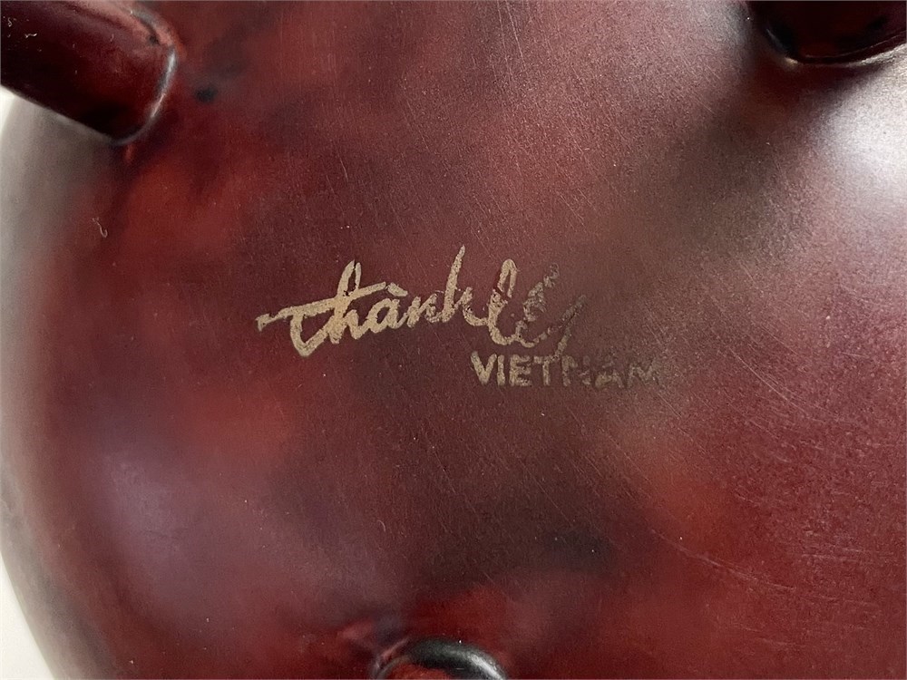 A three-legged wood bowl, painted with koi fish on the outside, and lacquered on the inside.  Signed on the bottom: Thanhl??, Vietnam.  Mostly good condition, a short crack on the underside of the lid.