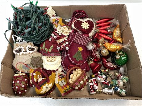 Really cute felt ornaments with metal tags on them about their meaning.  And other felt mittens, etc.  Also several small glass ornaments including birds with feather tails and little snowmen and Santas.  The whole box.