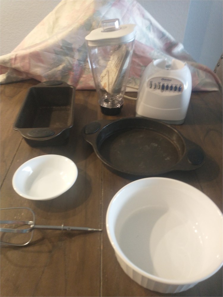 You get everything in the pictures there is a osterizer blender. Unknown working condition, two metal Oneida hands a CorningWare full and a Corelle bowl plus a mixing arm