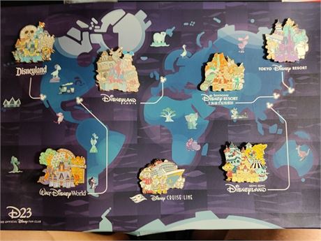 Disney Parks 7 Pin Collector Set Around the World 2022 D23 Gold Exclusive. All pins are in very good condition.