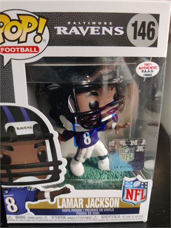 Lamar Jackson autographed Funko Pop with COA. CoA is by PAAS authentications. Lamar Jackson is last year's NFL reigning MVP.
