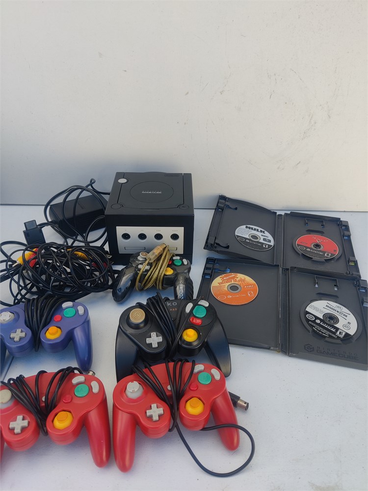 Nintendo Game Cube with 5 controllers, four games and power cord. Game system powers on but has not been tested other than powering on. Games included are Madden 06, Volcano Island, Cars and Hulk. Games look to be in good condition but no boxes or instructions.