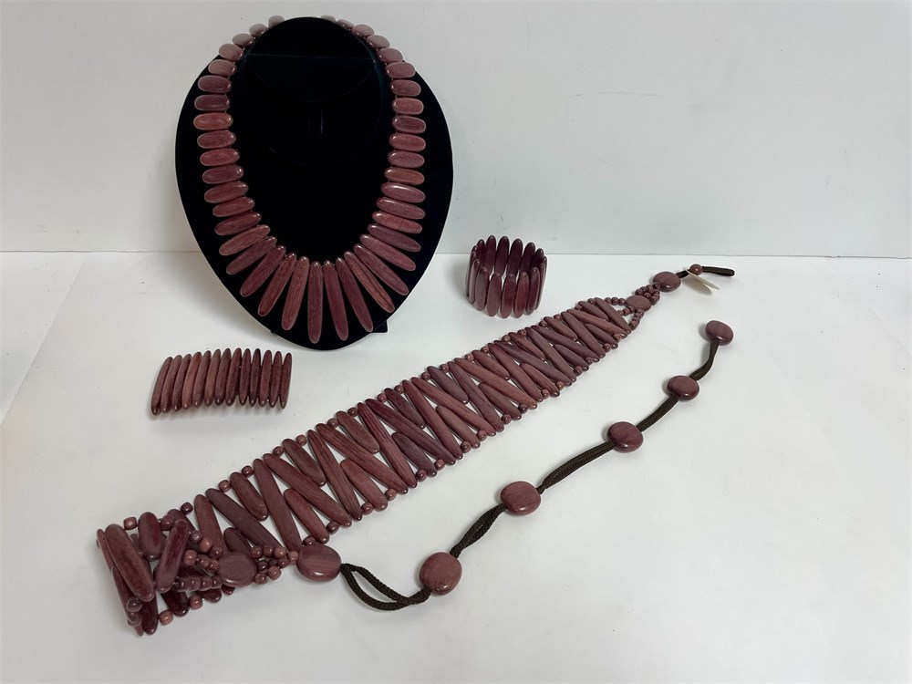 Assorted jewelry including a Costa Rican set made from wood: belt, barrette, bracelet, necklace, good condition.  Assorted rhinestone and bling jewelry, mostly shoe clips and earrings.  And 4 pairs of men's cufflinks.  All for the bid!