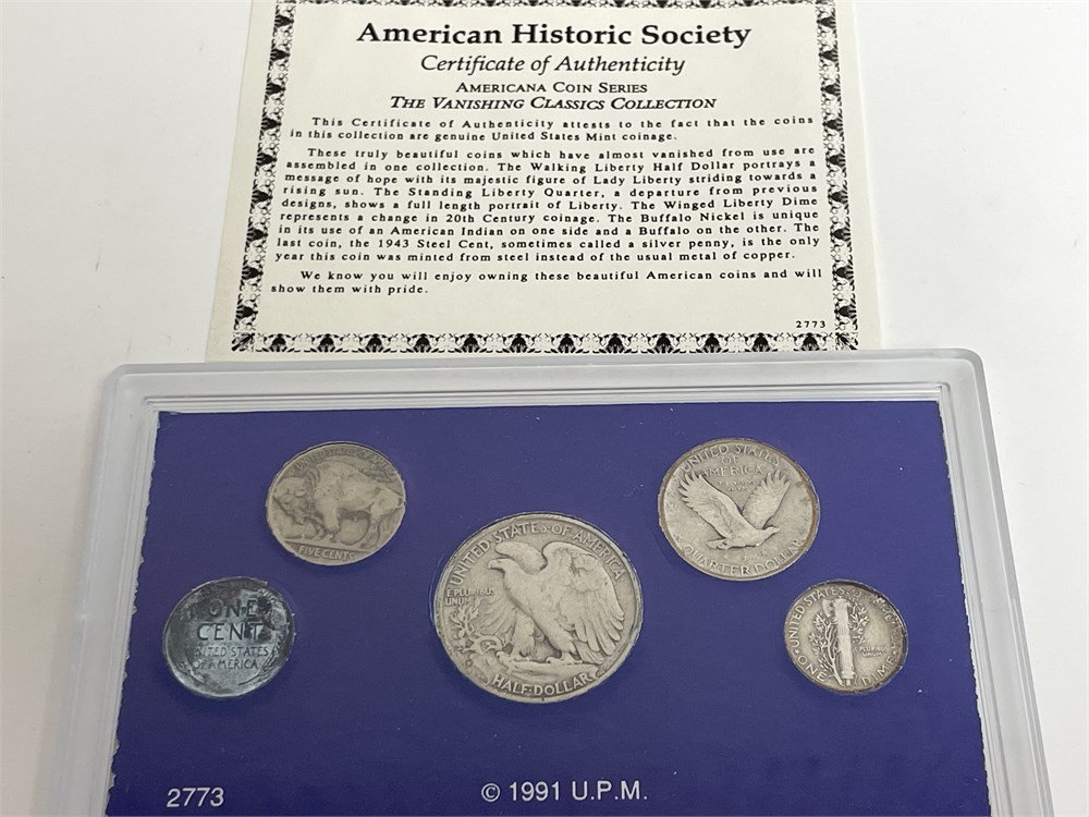 Slabbed set by The American Historic Society, with certificate.  Walking Liberty half, Standing Liberty quarter, Mercury dime, buffalo nickel, steel penny.