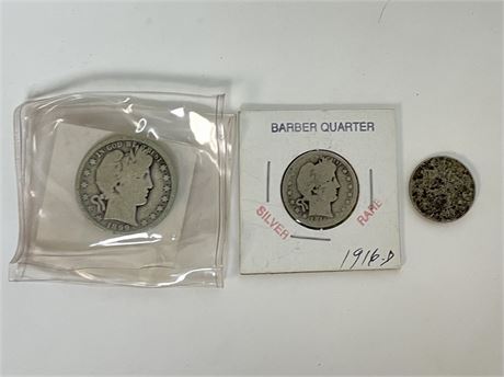 1916 D Barber silver quarter, 1899 O Barber silver quarter, 1905 V nickel.