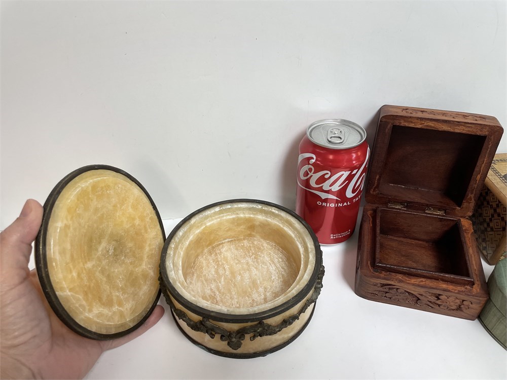 A round alabaster box, an Italian-made box with matching round tray, a little Russian lacquered box, an inlaid wood box with Japanese scene, and others as pictured.