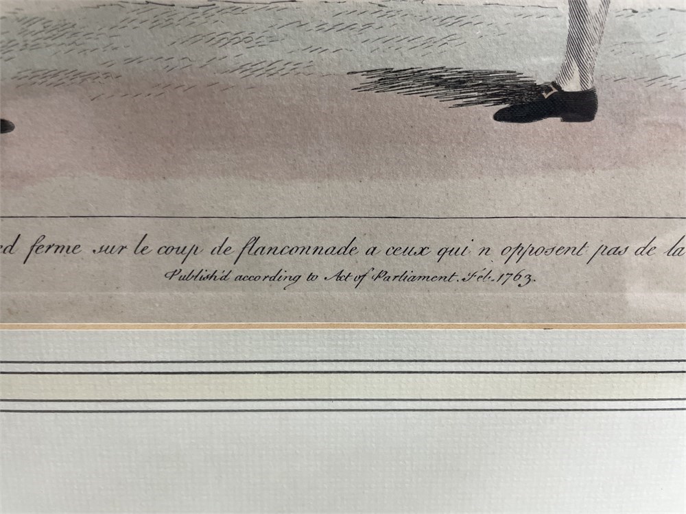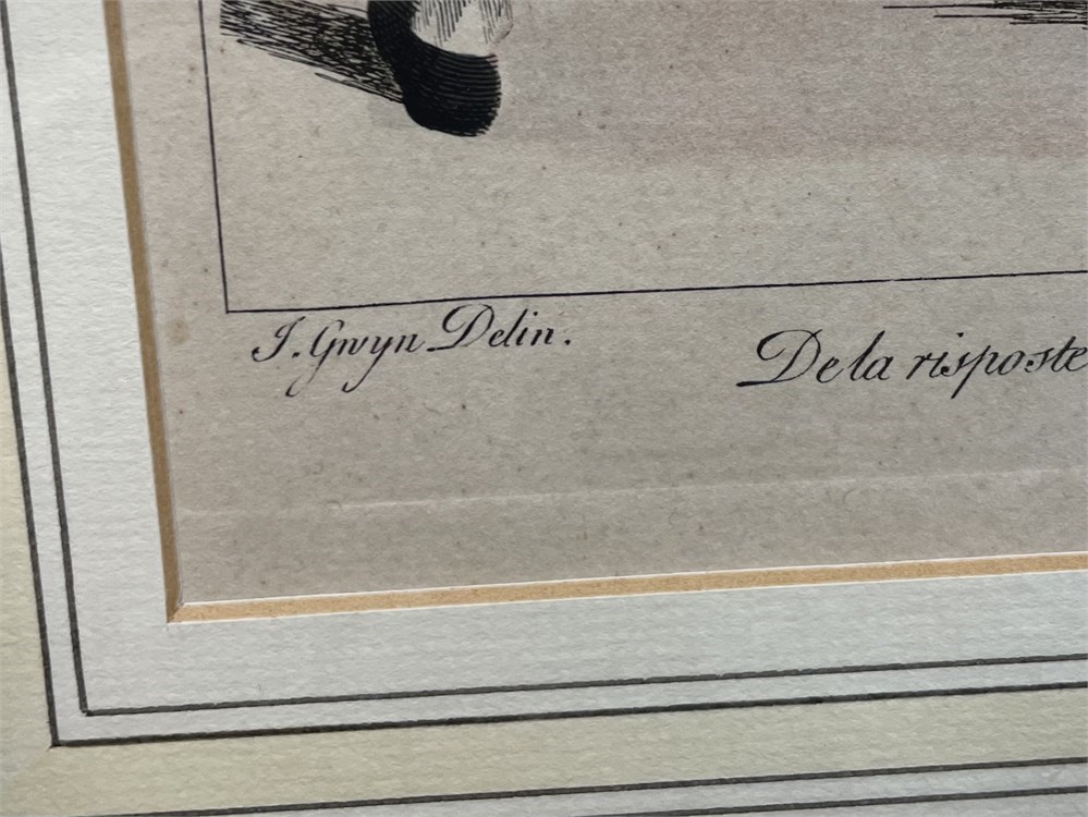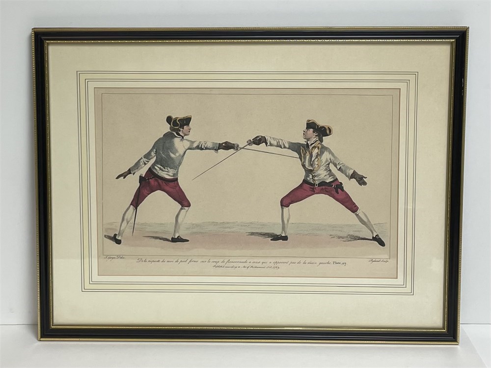 A French colored etching of two gentlemen fencing, with title and information along the bottom, please see photos.  Good condition, updated frame.