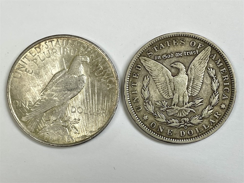 2 silver dollars:  1890 O Morgan and 1922 P Peace