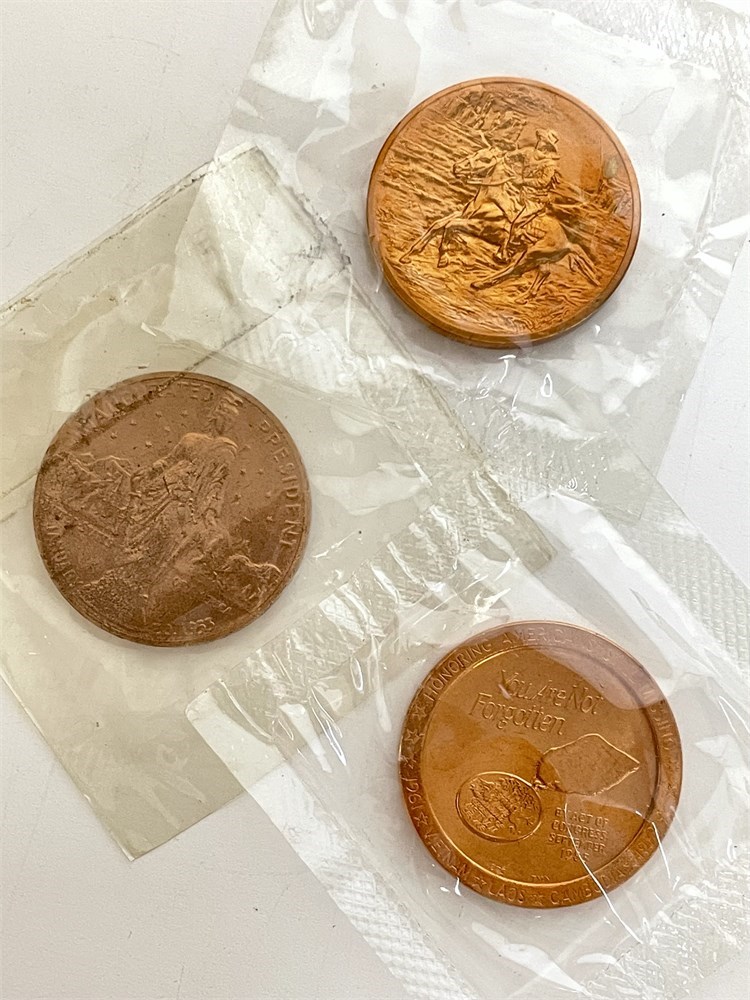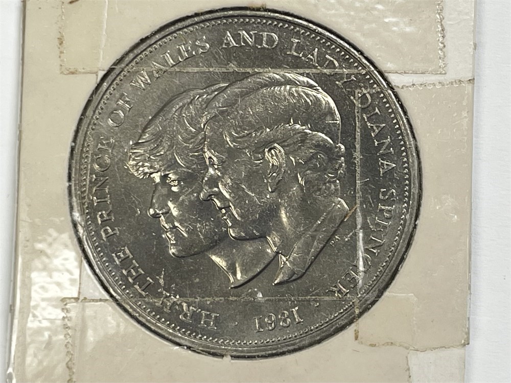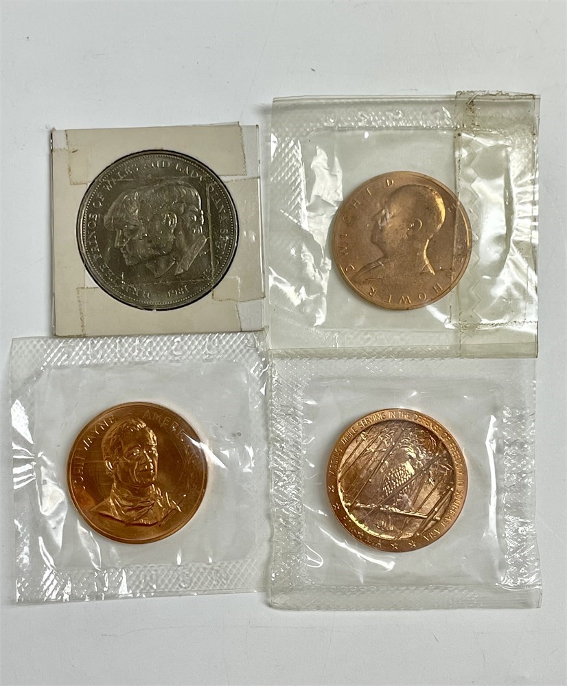A commemorative "coin" from the Royal Wedding of the Century, dated 1981, with Queen Elizabeth II on the front.  And 3 copper(?) medals: John Wayne, Dwight Eisenhower, Southeast Asia POW-MIA.