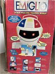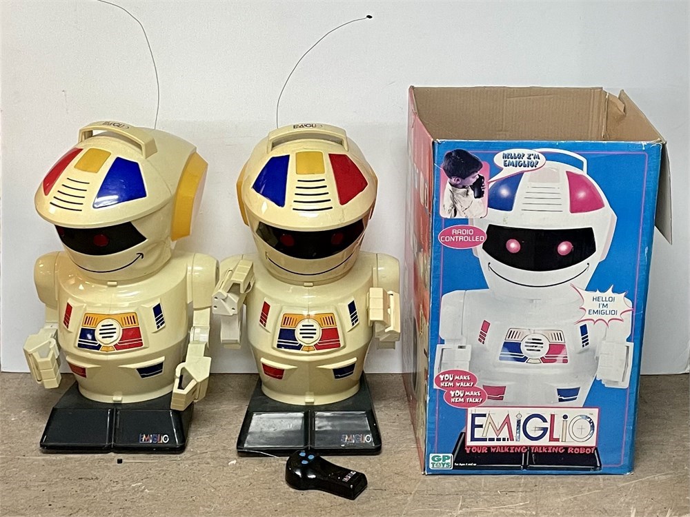 "Emiglio: Your Walking Talking Robot" - one works fine and the other has some issues.  These are not small; they are about 2 ft tall.  One box and one remote included.  There is also one tray that the robot can hold (optional) to serve you a drink.  There is also a photocopied instruction manual.  A cute nostalgic toy for 90's kids.