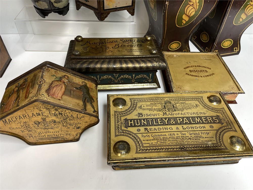 9 interesting English tins, two are Chinoiserie (ginger jar and lantern style), a matched pair, various others.  On the bottoms of some there is advertising for various biscuit makers.