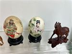 Assorted small collectibles plus a 10 1/2" ceramic figure.  Carved stone animals, hand painted eggs, horse with ivory eyes, joined mudmen scene, brass dragon, 3 resin figures on wood bases.
