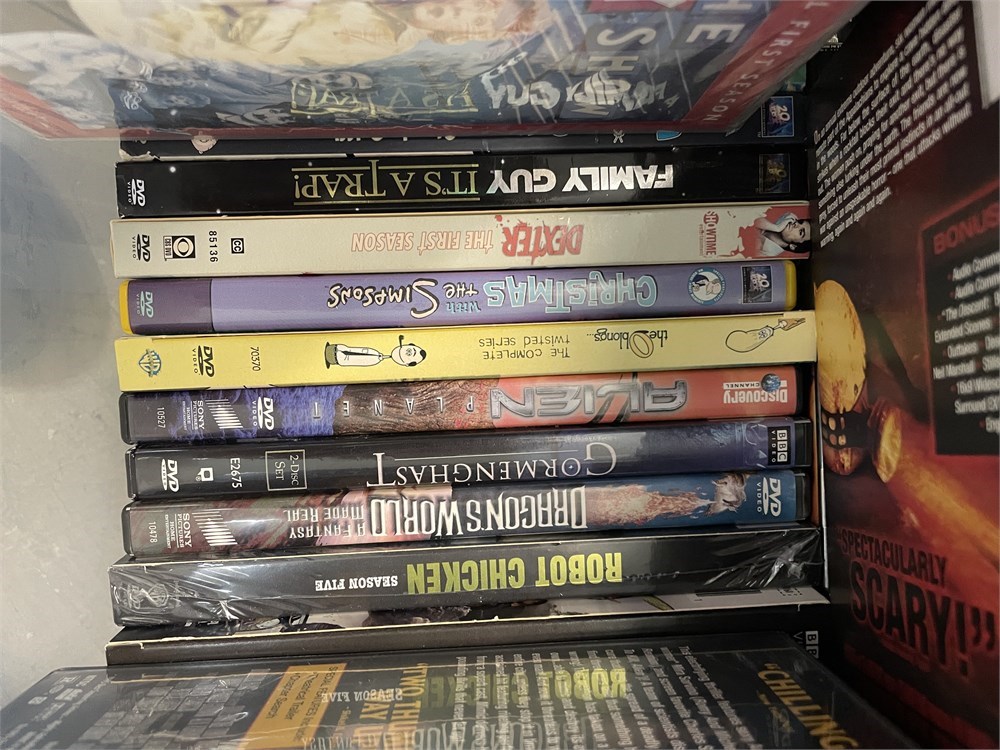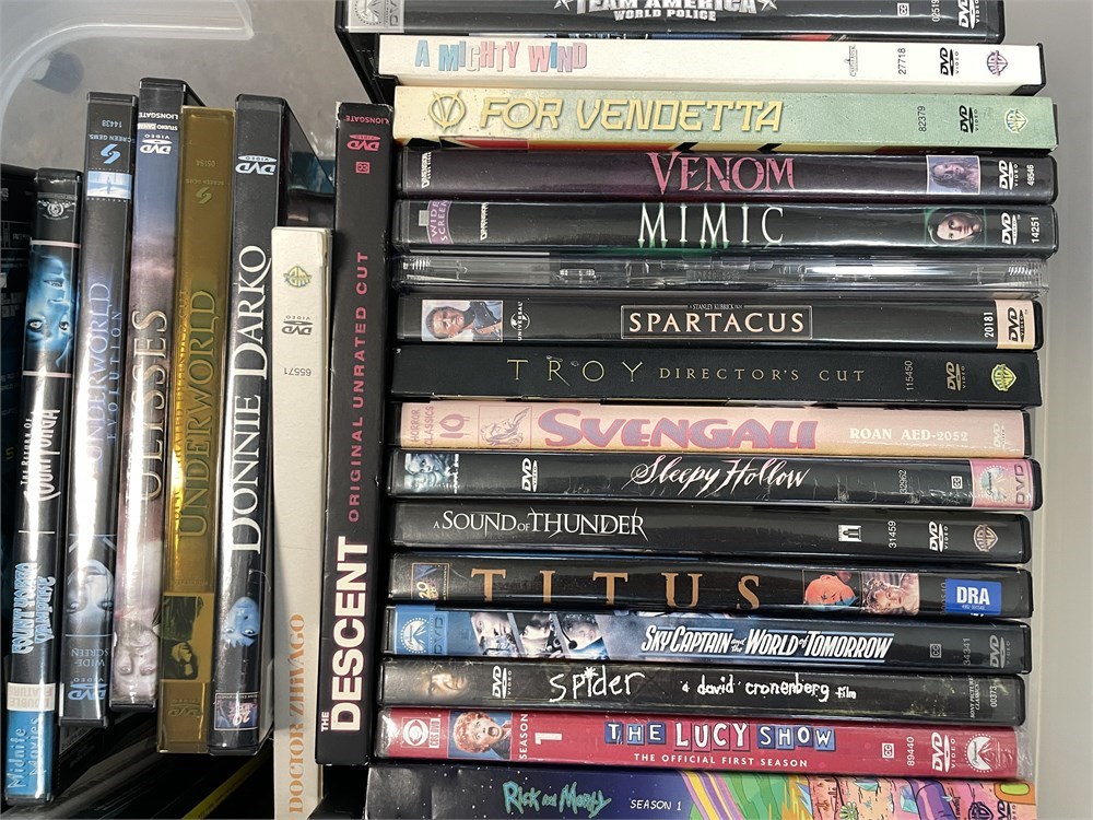 A like-new plastic bin with two layers packed full of movies and TV shows, etc., on DVD.  Horror, sci-fi, drama, comedy, TV series, classics, animation - big variety.  Estimated 100+ DVDs!