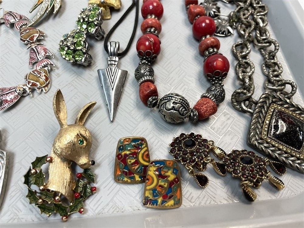A variety of costume jewelry, most are fairly modern including brands like Chico's.  Also a few vintage pieces like the cute Christmas pin.  Other fun pieces are the dragonfly earrings, glitzy bird pin, fish bracelet, and Packers earrings.  Nice group!
