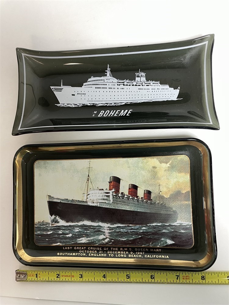 Also a RMS Queen Mary glass tray in good condition - it commemorates the last cruise of the R.M.S. Queen Mary from October 31-December 9, 1967, from Southampton, England to Long Beach, California. Marked "Jack Nadel, Inc. Culver City, Cal." on bottom.