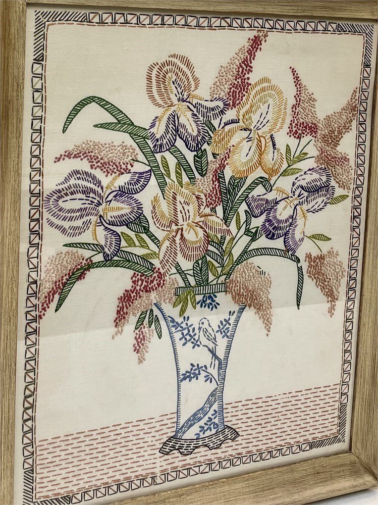 Two framed embroidery panels, vases of flowers, with a note on the back of each: Embroidered by Susan Moessinger, 1937.