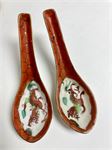 Vintage group.  Two Chinese bowls with spoons that match.  3 Chinese gold trimmed bowls.  Two pairs of decorated spoons (dragons, and sitting figures).  A single rice bowl.  And 2 small cups and saucers.  Marks, if any, are pictured.  Good general condition.