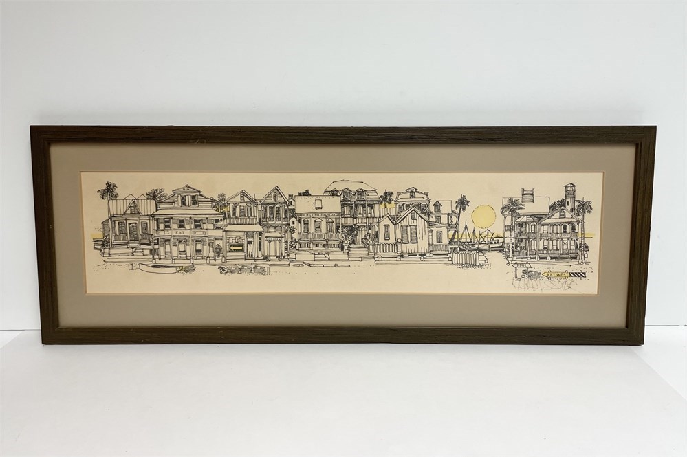 Please see the signature photo; we may have the artist's name wrong.  This is a vintage signed print of Key West with touches of yellow color, matted and framed.