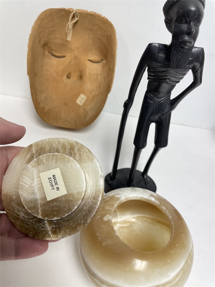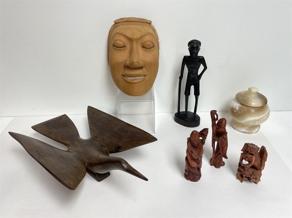International collectibles:  3 Chinese/Asian small carved wood figures.  A taller African carved figure.  A wood mask from Indonesia.  A bigger hardwood bird (repaired wing).  And a round stone box, made in Egypt.
