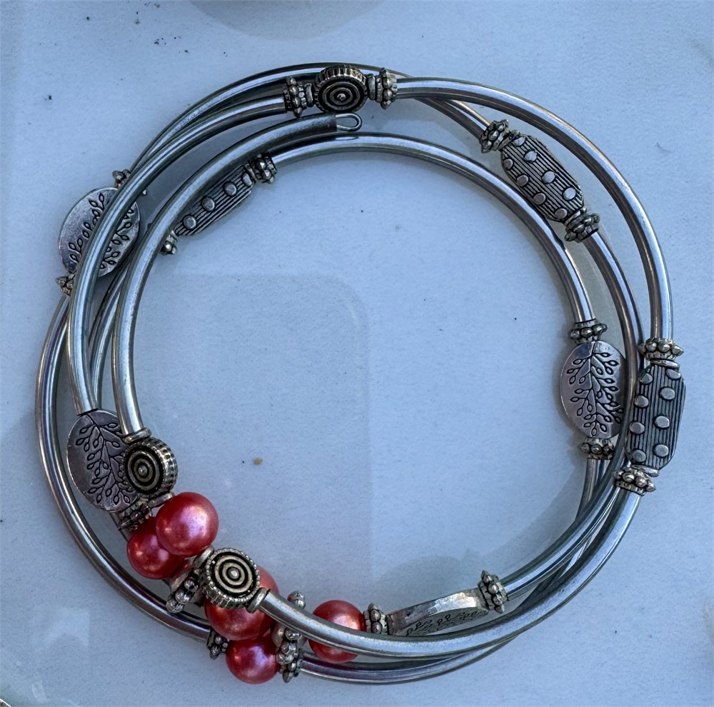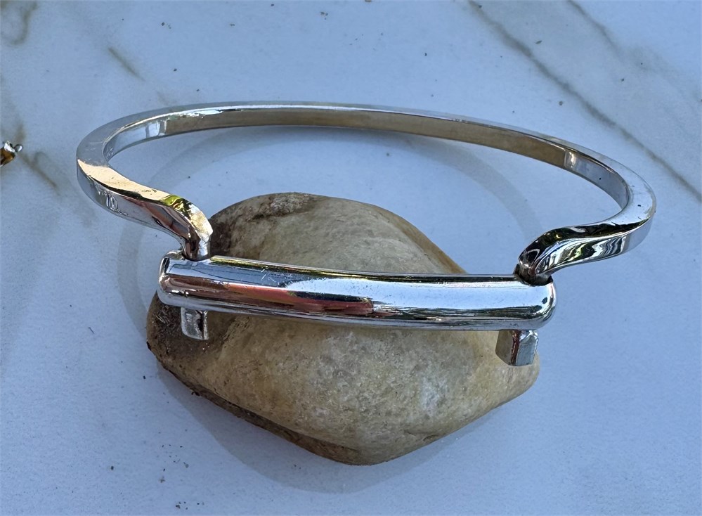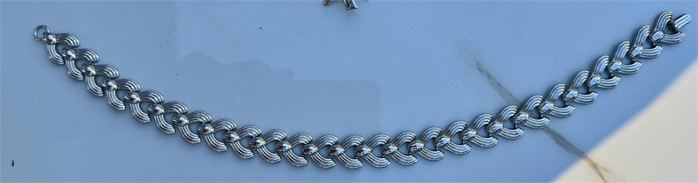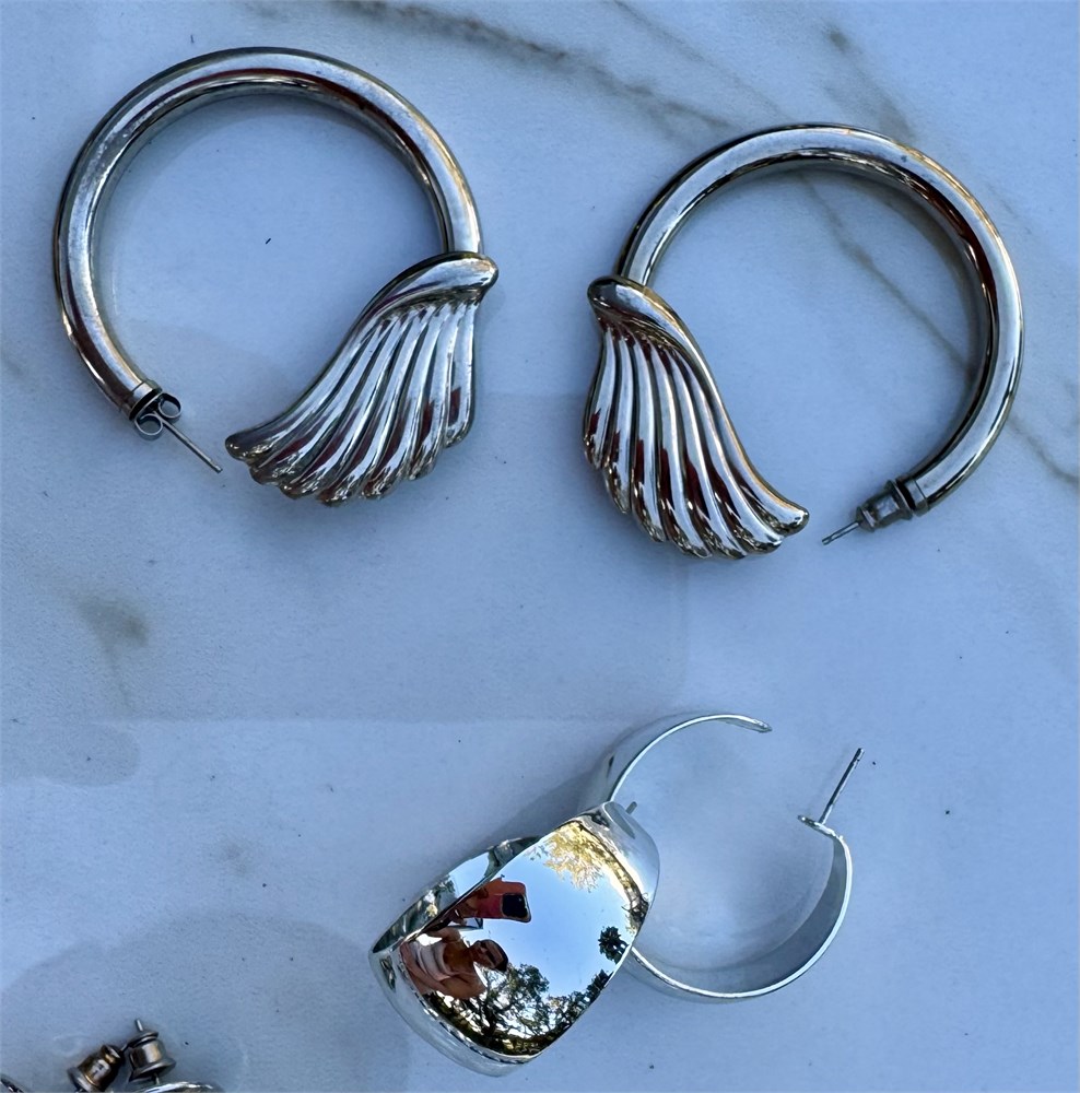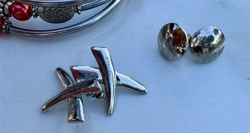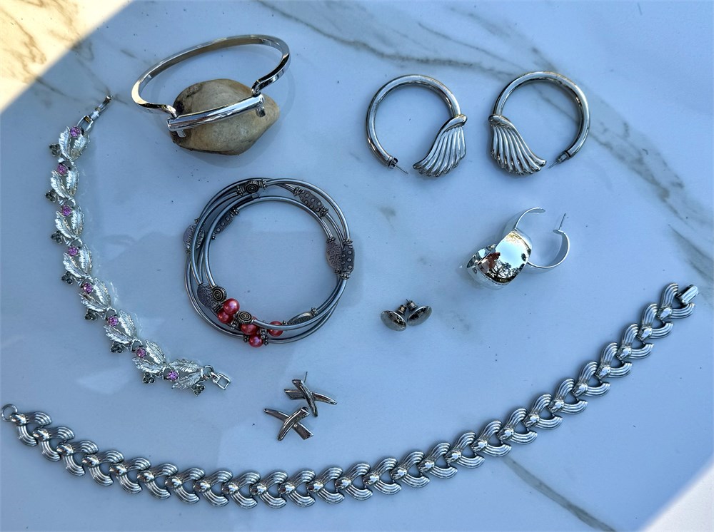 Lot includes an assortment of silver tone costume/fashion jewelry. Makers unknown or not markings. Includes 3 bracelets (7” largest measurement), 4 pairs of earrings, one necklace 15”.