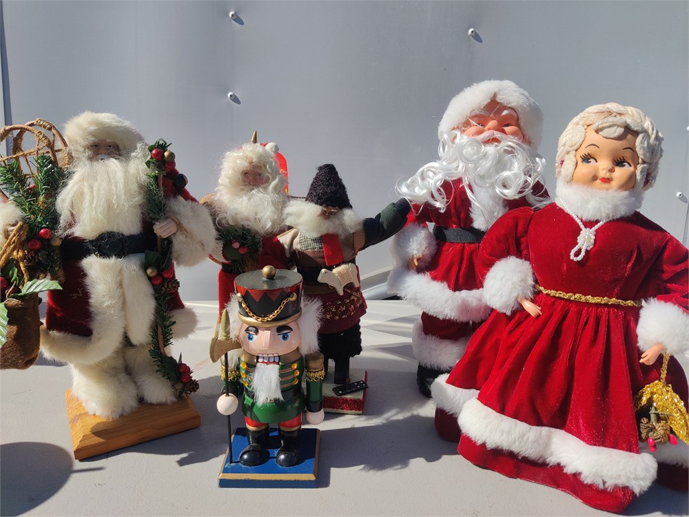 Nice lot of Christmas Santa Claus Miss Claus and nutcracker lot. There are six figure included. There are four Santa Claus one Mrs Claus and one nutcracker. The tallest Santa Claus stands approximately 14 in tall. Is that the bel