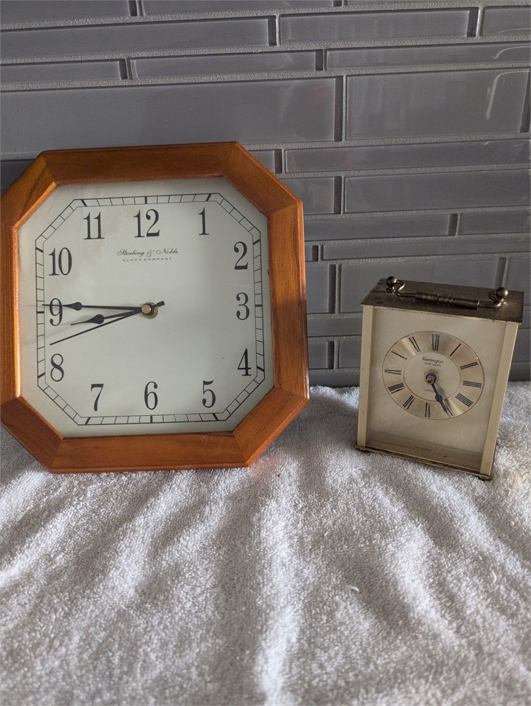 First clock is a sterling and Noble wood framed wall clock. Second is a gold tone Remington multi quarts mantle clock. The Remington is from West Germany. Very heavy. Both run on batteries