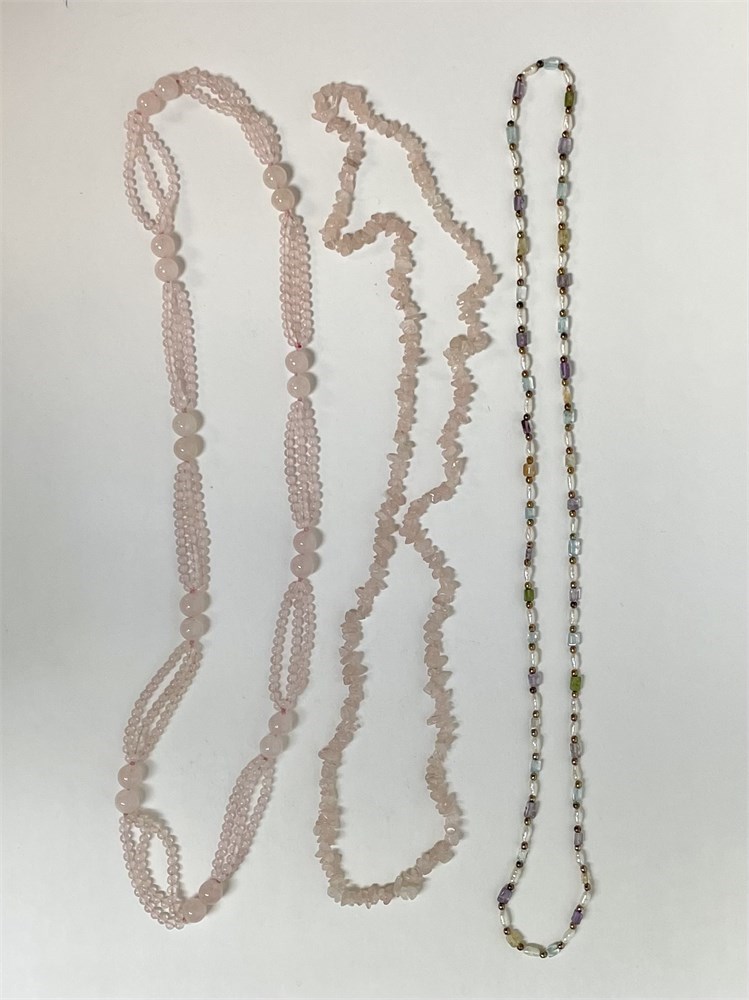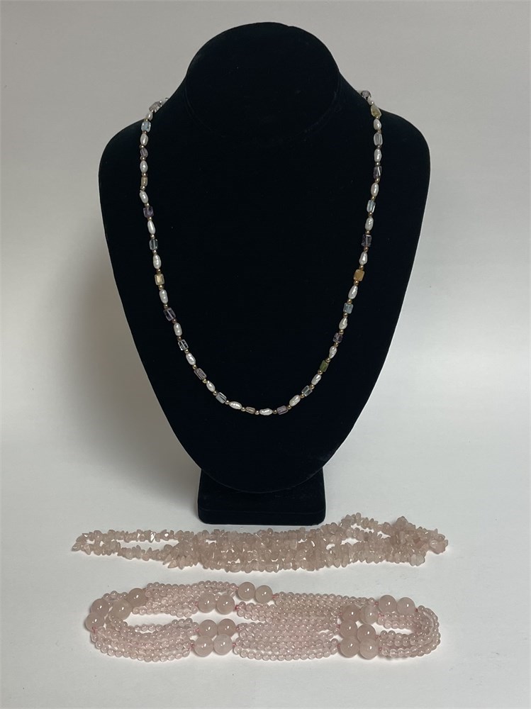 2 are rose quartz, and the 3rd is a pretty mixture of freshwater pearls and colored stones.
