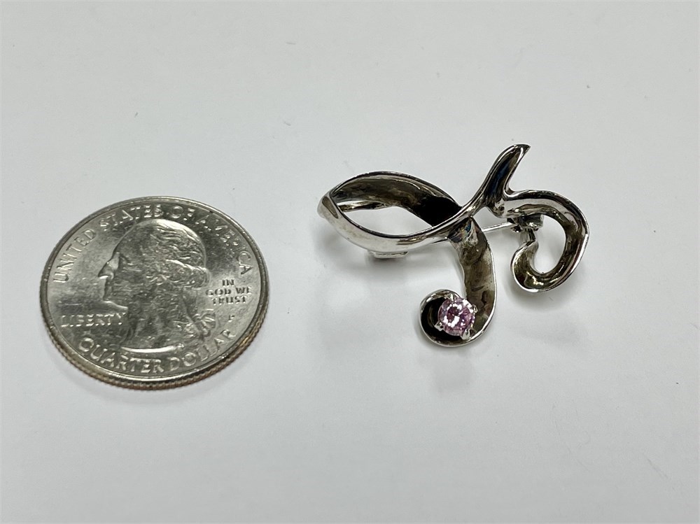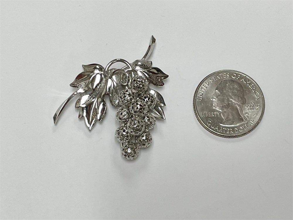 3 mid-century pins including grapes, a heart with pearl, and an abstract one with pink stone.  They have various designer initials that I'm not familiar with.  Also a pair of screwback earrings.  All pieces are marked sterling/925.